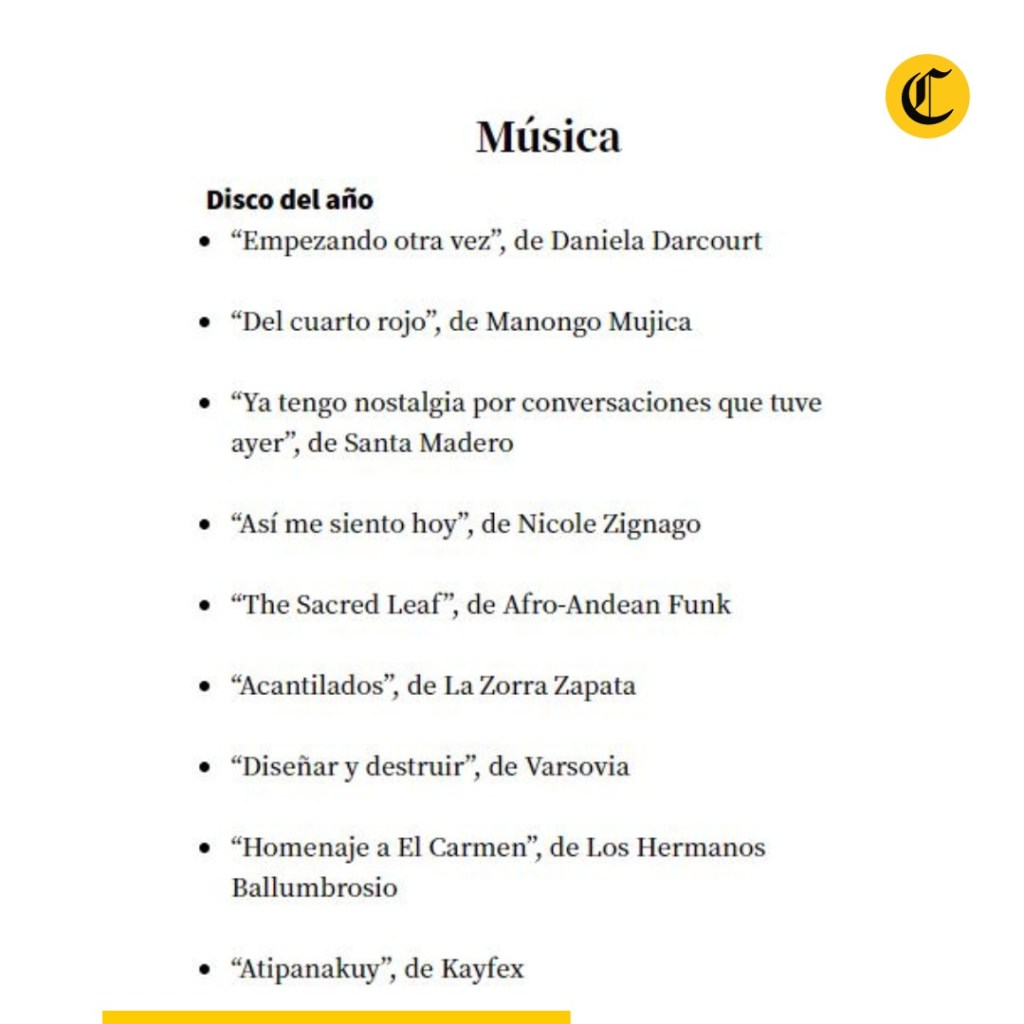 En la edición de este año, en la categoría a mejor álbum musical, han sido nominados artistas tan interesantes como Manongo Mujica, la banda de pop Santa Madero, y los Hermanos Vallumbrosio con su Homenaje a El Carmen. Y aunque valoramos su música y entendemos la alegría que pueda generarles este reconocimiento, nos sorprende que no todos parecen haber conectado la relación entre el concurso y quién lo está gestionando, el hecho de que detrás de las votaciones populares y de la seguramente honesta curación de este concurso, existe un grupo de poder, El Comercio, quien ha tenido una de las actuaciones más vergonzosas en la historia de la prensa peruana, al momento de retratar las manifestaciones contra el régimen dictatorial de Dina Boluarte, que ha dejado en su brevedad alrededor de 57 vidas perdidas, gracias a una infame represión con profunda raigambre racista y genocida.