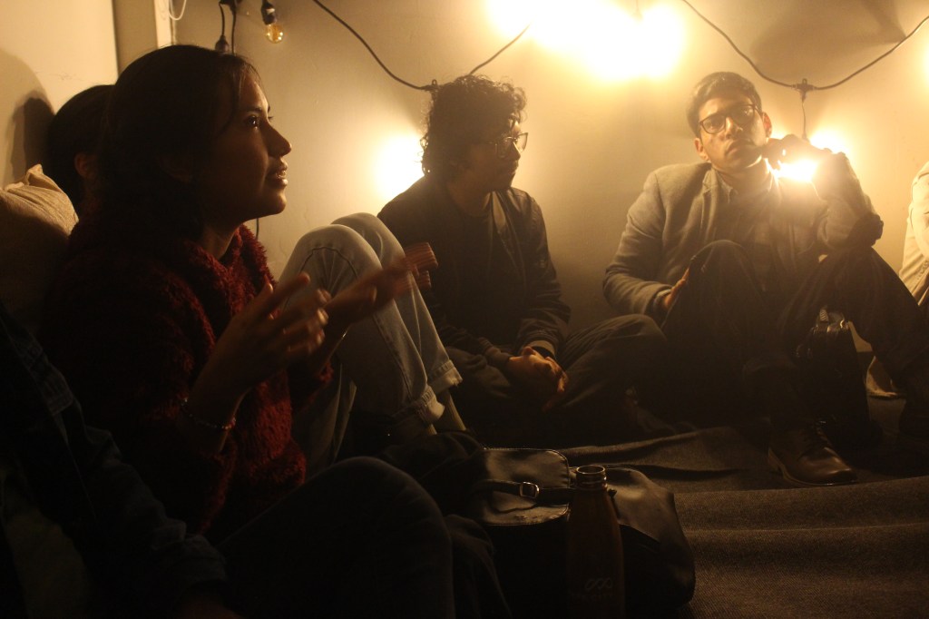 Erick Garay: Vuelvo a un salón sanmarquino luego de siete años. Esta vez es diferente: no hay sillas, ni pizarras ni docentes. El ambiente ha sido intervenido para una experiencia distinta de la de la cátedra más estándar. Invita a echarse en el suelo alfombrado, apoyar la cabeza en alguna almohada, hojear algún libro iluminado por esa cálida luz de pequeñas bombillas mientras la música previa al evento se sucede en los parlantes. Minutos antes, me había encontrado con gente que no veía hacía años, en Tubos, en los pasillos de la facultad. Van al salón en cuestión, el de la sesión de escucha. Una vez allí, cuando la gente va llenando el espacio, siento un elemento adicional de calidez en el ambiente. Amigos míos, o amigos de mis amigos. Me siento cómodo, parte de un grupo. No quiero decir, aclaro, que la mayoría fuera gente conocida, al contrario, eran desconocidos, pero la idea de estar todos allí, reunidos simplemente para escuchar música, le daba un tono de complicidad tranquila a lo que vendría.